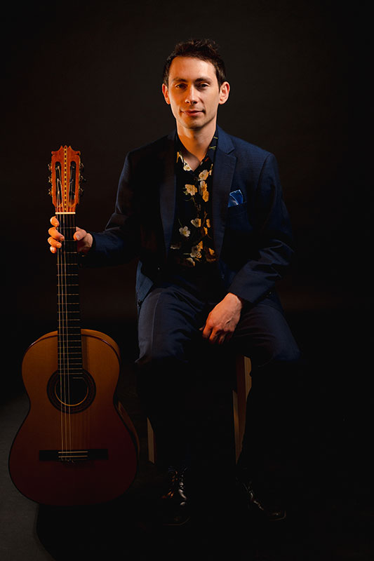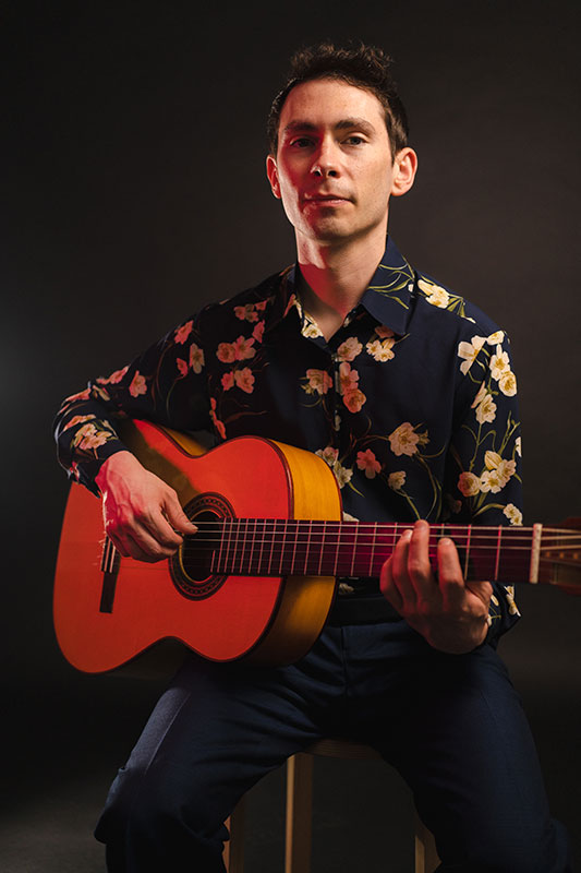 Aaron with his classical guitar made by luther Robert England, 2023 | Photo by Kenneth Leftridge Jr.